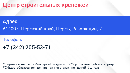 Центр строительных крепежей по адресу 614007, Пермский край, Пермь, Революции, 7 в дальнейшем Организация, размещена в следующих категориях: