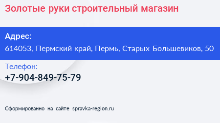 Золотые руки, строительный магазин по адресу 614053, Пермский край, Пермь, Старых Большевиков, 50 в дальнейшем Организация, размещена в следующих категориях: