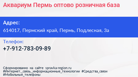 Аквариум-Пермь, оптово-розничная база по адресу 614017, Пермский край, Пермь, Подлесная, 3а в дальнейшем Организация, размещена в следующих категориях: