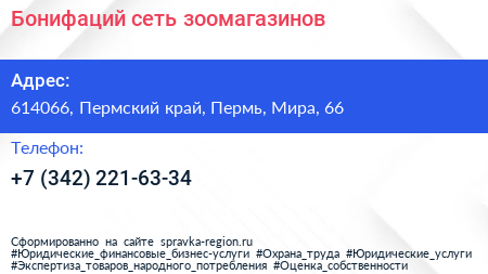 Бонифаций, сеть зоомагазинов по адресу 614066, Пермский край, Пермь, Мира, 66 в дальнейшем Организация, размещена в следующих категориях: