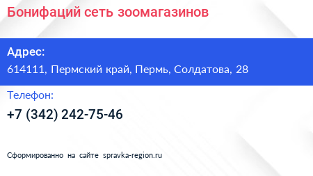 Бонифаций, сеть зоомагазинов по адресу 614111, Пермский край, Пермь, Солдатова, 28 в дальнейшем Организация, размещена в следующих категориях: