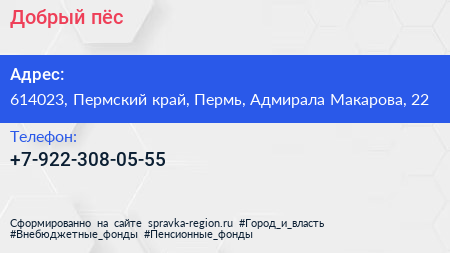 Добрый пёс по адресу 614023, Пермский край, Пермь, Адмирала Макарова, 22 в дальнейшем Организация, размещена в следующих категориях: