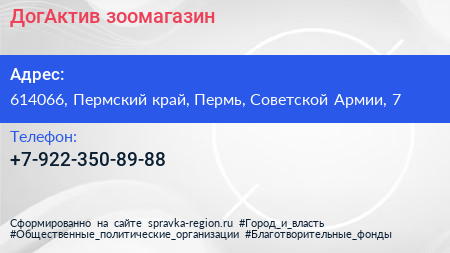 ДогАктив, зоомагазин по адресу 614066, Пермский край, Пермь, Советской Армии, 7 в дальнейшем Организация, размещена в следующих категориях: