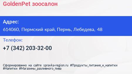 GoldenPet, зоосалон по адресу 614060, Пермский край, Пермь, Лебедева, 48 в дальнейшем Организация, размещена в следующих категориях: