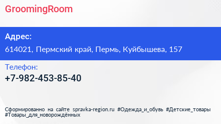 GroomingRoom по адресу 614021, Пермский край, Пермь, Куйбышева, 157 в дальнейшем Организация, размещена в следующих категориях: