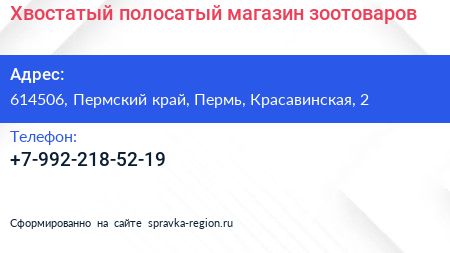 Хвостатый полосатый, магазин зоотоваров по адресу 614506, Пермский край, Пермь, Красавинская, 2 в дальнейшем Организация, размещена в следующих категориях:
