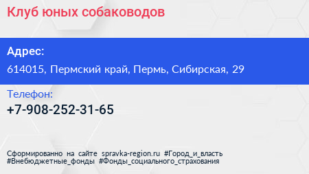 Клуб юных собаководов по адресу 614015, Пермский край, Пермь, Сибирская, 29 в дальнейшем Организация, размещена в следующих категориях: