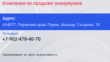 Компания по продаже аквариумов по адресу 614077, Пермский край, Пермь, бульвар Гагарина, 74 в дальнейшем Организация, размещена в следующих категориях: