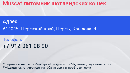 Muscat, питомник шотландских кошек по адресу 614045, Пермский край, Пермь, Крылова, 4 в дальнейшем Организация, размещена в следующих категориях:
