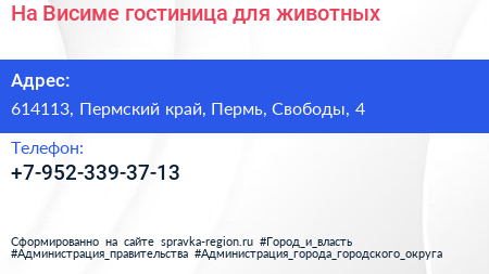 На Висиме, гостиница для животных по адресу 614113, Пермский край, Пермь, Свободы, 4 в дальнейшем Организация, размещена в следующих категориях: