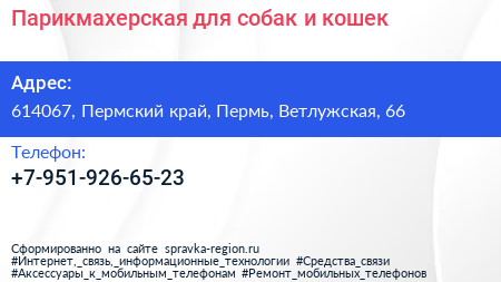 Парикмахерская для собак и кошек по адресу 614067, Пермский край, Пермь, Ветлужская, 66 в дальнейшем Организация, размещена в следующих категориях: