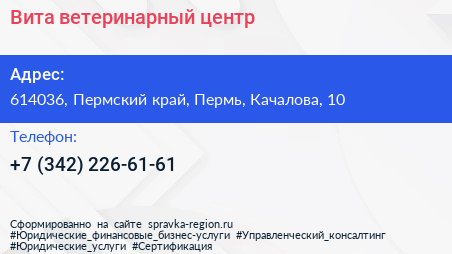 Вита, ветеринарный центр по адресу 614036, Пермский край, Пермь, Качалова, 10 в дальнейшем Организация, размещена в следующих категориях: