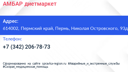 АМБАР, диетмаркет по адресу 614002, Пермский край, Пермь, Николая Островского, 93д в дальнейшем Организация, размещена в следующих категориях: