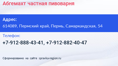 Абгемахт, частная пивоварня по адресу 614089, Пермский край, Пермь, Самаркандская, 54 в дальнейшем Организация, размещена в следующих категориях: