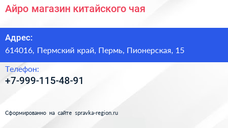 Айро, магазин китайского чая по адресу 614016, Пермский край, Пермь, Пионерская, 15 в дальнейшем Организация, размещена в следующих категориях: