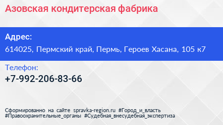 Азовская кондитерская фабрика по адресу 614025, Пермский край, Пермь, Героев Хасана, 105 к7 в дальнейшем Организация, размещена в следующих категориях: