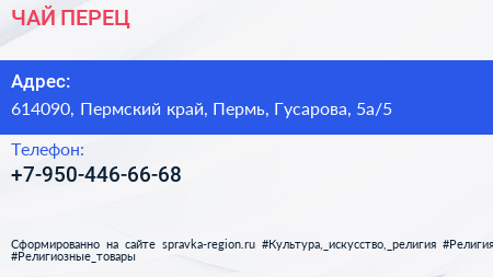 ЧАЙ-ПЕРЕЦ по адресу 614090, Пермский край, Пермь, Гусарова, 5а/5 в дальнейшем Организация, размещена в следующих категориях: