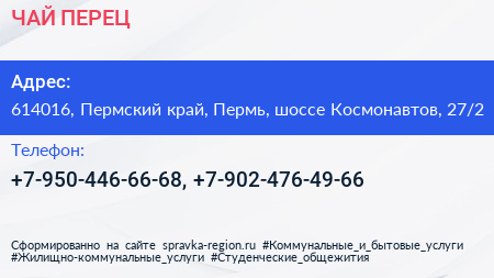 ЧАЙ-ПЕРЕЦ по адресу 614016, Пермский край, Пермь, шоссе Космонавтов, 27/2 в дальнейшем Организация, размещена в следующих категориях: