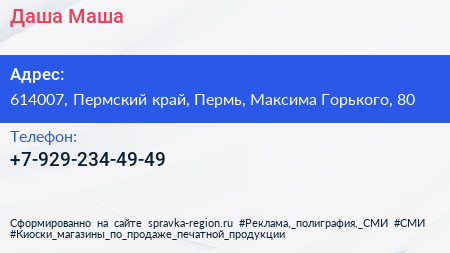 Даша Маша по адресу 614007, Пермский край, Пермь, Максима Горького, 80 в дальнейшем Организация, размещена в следующих категориях: