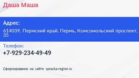 Даша Маша по адресу 614039, Пермский край, Пермь, Комсомольский проспект, 35 в дальнейшем Организация, размещена в следующих категориях: