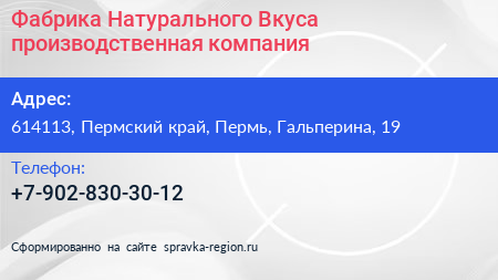 Фабрика Натурального Вкуса, производственная компания по адресу 614113, Пермский край, Пермь, Гальперина, 19 в дальнейшем Организация, размещена в следующих категориях:
