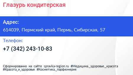 Глазурь, кондитерская по адресу 614039, Пермский край, Пермь, Сибирская, 57 в дальнейшем Организация, размещена в следующих категориях: