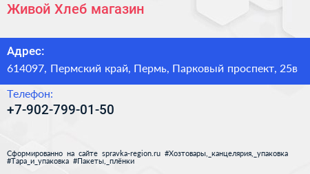 Живой Хлеб, магазин по адресу 614097, Пермский край, Пермь, Парковый проспект, 25в в дальнейшем Организация, размещена в следующих категориях:
