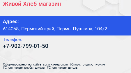 Живой Хлеб, магазин по адресу 614068, Пермский край, Пермь, Пушкина, 104/2 в дальнейшем Организация, размещена в следующих категориях: