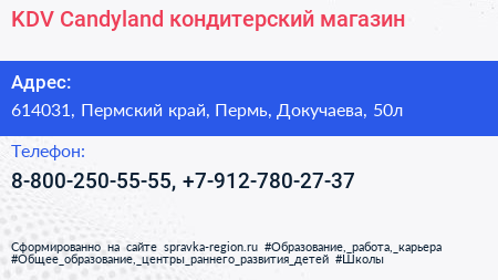 KDV Candyland, кондитерский магазин по адресу 614031, Пермский край, Пермь, Докучаева, 50л в дальнейшем Организация, размещена в следующих категориях: