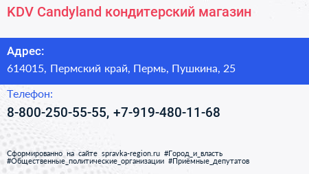 KDV Candyland, кондитерский магазин по адресу 614015, Пермский край, Пермь, Пушкина, 25 в дальнейшем Организация, размещена в следующих категориях: