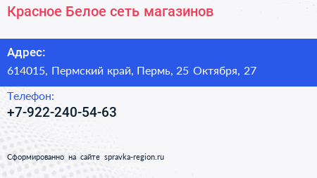 Красное & Белое, сеть магазинов по адресу 614015, Пермский край, Пермь, 25 Октября, 27 в дальнейшем Организация, размещена в следующих категориях: