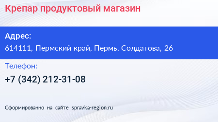 Крепар, продуктовый магазин по адресу 614111, Пермский край, Пермь, Солдатова, 26 в дальнейшем Организация, размещена в следующих категориях:
