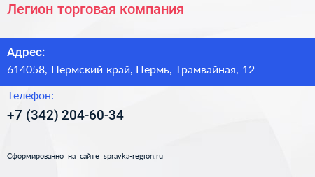 Легион, торговая компания по адресу 614058, Пермский край, Пермь, Трамвайная, 12 в дальнейшем Организация, размещена в следующих категориях: