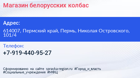 Магазин белорусских колбас по адресу 614007, Пермский край, Пермь, Николая Островского, 101/4 в дальнейшем Организация, размещена в следующих категориях: