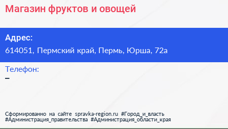 Магазин фруктов и овощей по адресу 614051, Пермский край, Пермь, Юрша, 72а в дальнейшем Организация, размещена в следующих категориях:
