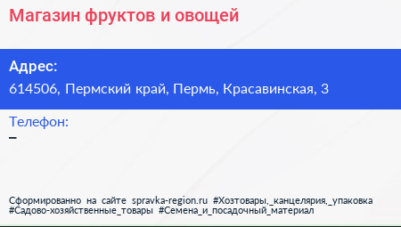 Магазин фруктов и овощей по адресу 614506, Пермский край, Пермь, Красавинская, 3 в дальнейшем Организация, размещена в следующих категориях: