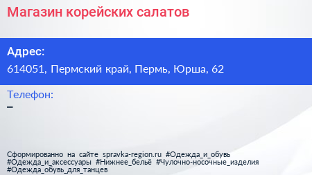 Магазин корейских салатов по адресу 614051, Пермский край, Пермь, Юрша, 62 в дальнейшем Организация, размещена в следующих категориях: