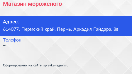 Магазин мороженого по адресу 614077, Пермский край, Пермь, Аркадия Гайдара, 8в в дальнейшем Организация, размещена в следующих категориях:
