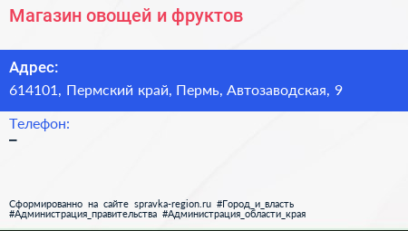 Магазин овощей и фруктов по адресу 614101, Пермский край, Пермь, Автозаводская, 9 в дальнейшем Организация, размещена в следующих категориях: