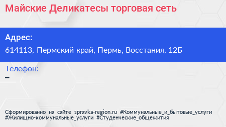 Майские Деликатесы, торговая сеть по адресу 614113, Пермский край, Пермь, Восстания, 12Б в дальнейшем Организация, размещена в следующих категориях: