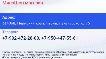 МясоШоп, магазин по адресу 614068, Пермский край, Пермь, Луначарского, 96 в дальнейшем Организация, размещена в следующих категориях: