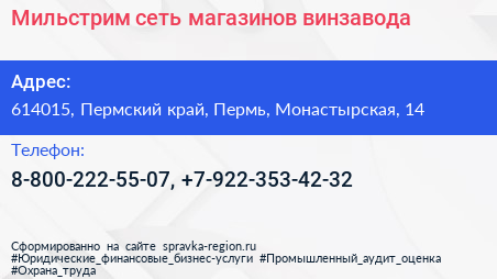 Мильстрим, сеть магазинов винзавода по адресу 614015, Пермский край, Пермь, Монастырская, 14 в дальнейшем Организация, размещена в следующих категориях: