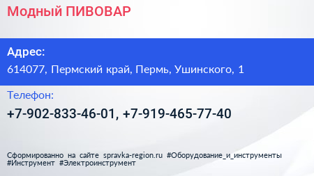Модный ПИВОВАР по адресу 614077, Пермский край, Пермь, Ушинского, 1 в дальнейшем Организация, размещена в следующих категориях: