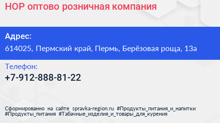 НОР, оптово-розничная компания по адресу 614025, Пермский край, Пермь, Берёзовая роща, 13а в дальнейшем Организация, размещена в следующих категориях: