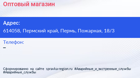 Оптовый магазин по адресу 614058, Пермский край, Пермь, Пожарная, 18/3 в дальнейшем Организация, размещена в следующих категориях: