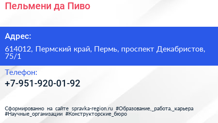 Пельмени да Пиво по адресу 614012, Пермский край, Пермь, проспект Декабристов, 75/1 в дальнейшем Организация, размещена в следующих категориях: