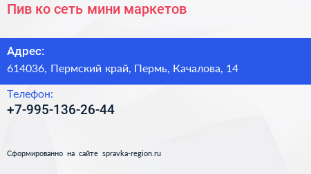 Пив & ко, сеть мини-маркетов по адресу 614036, Пермский край, Пермь, Качалова, 14 в дальнейшем Организация, размещена в следующих категориях: