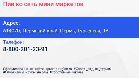 Пив & ко, сеть мини-маркетов по адресу 614070, Пермский край, Пермь, Тургенева, 16 в дальнейшем Организация, размещена в следующих категориях: