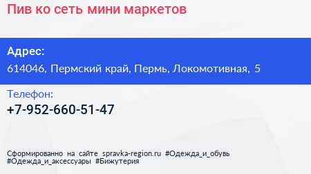 Пив & ко, сеть мини-маркетов по адресу 614046, Пермский край, Пермь, Локомотивная, 5 в дальнейшем Организация, размещена в следующих категориях:
