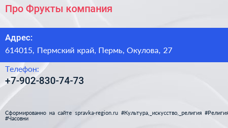Про Фрукты, компания по адресу 614015, Пермский край, Пермь, Окулова, 27 в дальнейшем Организация, размещена в следующих категориях: